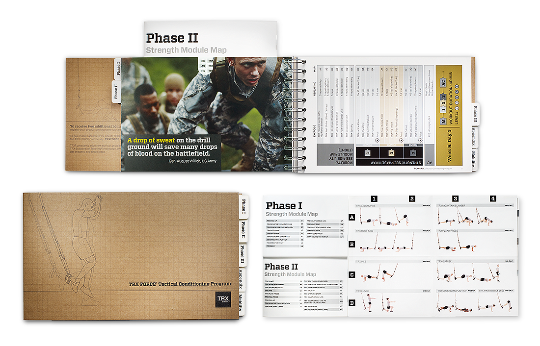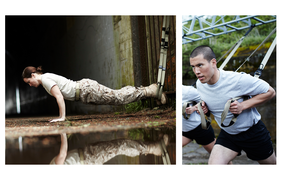 Create a TRX training kit for military use that including the main product, user manual and exercise pamphlets while also withstand frequent use and various weather conditions. While design, production and manufacturing of the new product was underway, we would also have to combat the marketing aspect at the same time. This would include military specific (army, navy and marine) photography of the product and the product in use.